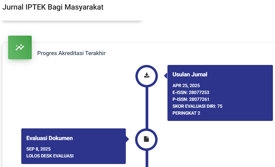 Jurnal IPTEK Bagi Masyarakat has successfully passed the Desk Evaluation stage in the journal accreditation process. The self-evaluation score was 75, with an internal ranking of 2.